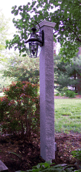 New England Gray Granite lanternposts from Spectacle Mountain in Barre Vermont are a natural in any outdoor setting. These impressive lanternposts are 6 3/8" square, 8 feet long, weigh nearly 400 lbs and are center bored end to end for wiring. Topmount granite lanternposts are adorned with our exquisitely finished red cedar cap with universal fixture mounting coupler. To ensure the fixture is always secure, the lantern post cap is fastened deep into the stone with 4 inch screws and expansion anchors. The sidemount granite lanternpost includes our New England style pyramid cap glued to stone and universal fixture mounting hardware to fit most side mount fixtures. Because of the massive weight of our Granite lanternpost, our installers must employ the work truck crane to lower the post into the ground hole. Your location for installation must be accessible with our work truck. Granite lanternposts are shipped motor freight in a solid protective crate.